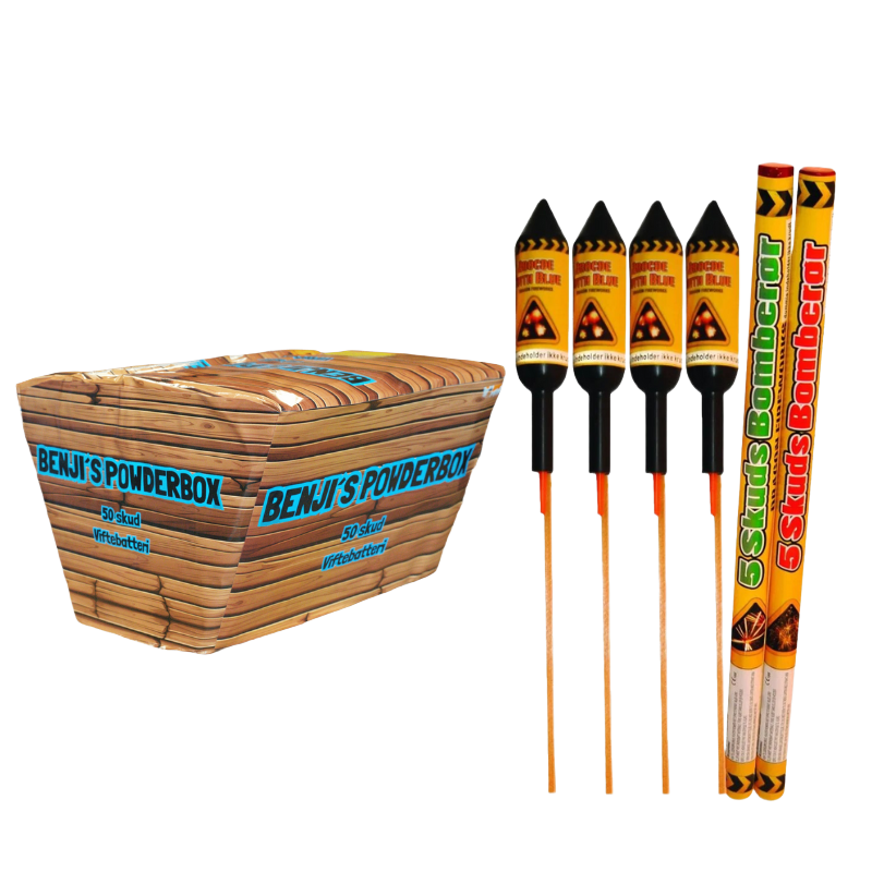 [TILBUD] 50 skuds batteri: Benji’s Powderbox + Sortiment med Raketter og Bomberør